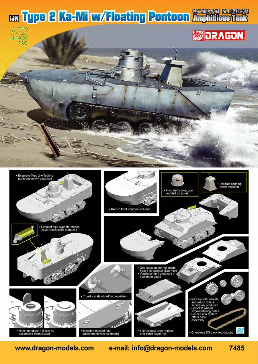 Dragon has already produced a stunning 1/72 scale kit of the Japanese Type 2 "Ka-Mi" amphibious tank. The "Ka Mi" was the first amphibious tank used by the Imperial Japanese Navy (IJN). It was designed for Japanese landing forces performing amphibious invasions of Pacific islands not possessing regular port facilities. Production of the Type 2 commenced in 1942 and a total of 184 amphibious tanks were made. When used in water, large pontoons were attached to the glacis plate and rear deck to give it a top speed of 10km/h in water. These pontoons could be shed as soon as the vehicle reached land.