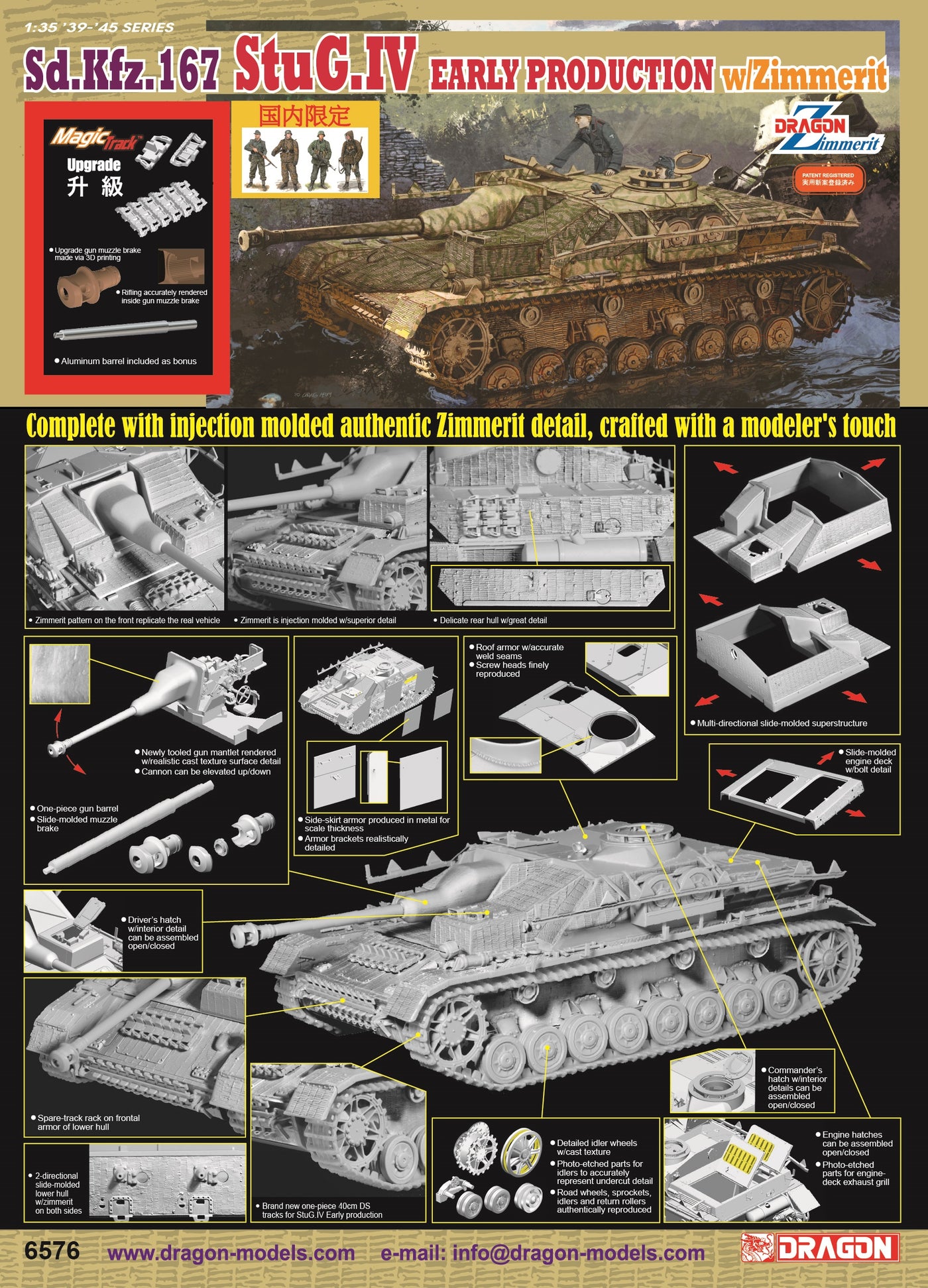 {"id":9389065961720,"title":"1\/35 Sd.Kfz.167 StuG.IV EARLY PRODUCTION w\/ZIMMERIT [Bonus Version]","handle":"1-35-sd-kfz-167-stug-iv-early-production-w-zimmerit-bonus-version","description":"\u003ch3\u003eDragon 6576 - 1\/35 Sd.Kfz.167 StuG.IV EARLY PRODUCTION w\/ZIMMERIT [Bonus Version]\u003c\/h3\u003e\n\u003cp\u003e\u003cbr\u003e\u003c\/p\u003e\n\u003cp\u003e\u003cspan style=\"color: rgb(255, 42, 0);\"\u003e\u003cb\u003eBonus: Figures set\u003c\/b\u003e\u003c\/span\u003e\u003c\/p\u003e\n\u003cp\u003e \u003c\/p\u003e\n\u003cp\u003e\u003cspan style=\"color: rgb(255, 42, 0);\"\u003e\u003cb\u003ePre-order Now! \u003c\/b\u003e\u003c\/span\u003e\u003c\/p\u003e\n\u003cp\u003e\u003cspan style=\"color: rgb(43, 0, 255);\"\u003e\u003cb\u003eRelease date: 1st Quarter of 2026\u003c\/b\u003e\u003c\/span\u003e\u003c\/p\u003e","published_at":"2026-01-26T16:06:37+08:00","created_at":"2026-01-26T16:05:00+08:00","vendor":"Dragon","type":"Military","tags":["1\/35","Brand_Dragon","Dragon","Military","Scale Models","Scale_1\/35","Series_Military Vehicles","Status_Pre-order"],"price":40800,"price_min":40800,"price_max":40800,"available":true,"price_varies":false,"compare_at_price":null,"compare_at_price_min":0,"compare_at_price_max":0,"compare_at_price_varies":false,"variants":[{"id":47925120958712,"title":"Default Title","option1":"Default Title","option2":null,"option3":null,"sku":"DR06576_2026VerCN","requires_shipping":true,"taxable":true,"featured_image":null,"available":true,"name":"1\/35 Sd.Kfz.167 StuG.IV EARLY PRODUCTION w\/ZIMMERIT [Bonus Version]","public_title":null,"options":["Default Title"],"price":40800,"weight":1500,"compare_at_price":null,"inventory_management":"shopify","barcode":null,"requires_selling_plan":false,"selling_plan_allocations":[]}],"images":["\/\/www.cyber-hobby.com\/cdn\/shop\/files\/6576poster2026-CN.jpg?v=1769414789","\/\/www.cyber-hobby.com\/cdn\/shop\/files\/6576CNbonus.jpg?v=1769414789","\/\/www.cyber-hobby.com\/cdn\/shop\/files\/6576box2026.jpg?v=1769414784"],"featured_image":"\/\/www.cyber-hobby.com\/cdn\/shop\/files\/6576poster2026-CN.jpg?v=1769414789","options":["Title"],"media":[{"alt":null,"id":39153192501496,"position":1,"preview_image":{"aspect_ratio":0.721,"height":2476,"width":1784,"src":"\/\/www.cyber-hobby.com\/cdn\/shop\/files\/6576poster2026-CN.jpg?v=1769414789"},"aspect_ratio":0.721,"height":2476,"media_type":"image","src":"\/\/www.cyber-hobby.com\/cdn\/shop\/files\/6576poster2026-CN.jpg?v=1769414789","width":1784},{"alt":null,"id":39153192468728,"position":2,"preview_image":{"aspect_ratio":1.052,"height":191,"width":201,"src":"\/\/www.cyber-hobby.com\/cdn\/shop\/files\/6576CNbonus.jpg?v=1769414789"},"aspect_ratio":1.052,"height":191,"media_type":"image","src":"\/\/www.cyber-hobby.com\/cdn\/shop\/files\/6576CNbonus.jpg?v=1769414789","width":201},{"alt":null,"id":39153193812216,"position":3,"preview_image":{"aspect_ratio":1.559,"height":513,"width":800,"src":"\/\/www.cyber-hobby.com\/cdn\/shop\/files\/6576box2026.jpg?v=1769414784"},"aspect_ratio":1.559,"height":513,"media_type":"image","src":"\/\/www.cyber-hobby.com\/cdn\/shop\/files\/6576box2026.jpg?v=1769414784","width":800}],"requires_selling_plan":false,"selling_plan_groups":[],"content":"\u003ch3\u003eDragon 6576 - 1\/35 Sd.Kfz.167 StuG.IV EARLY PRODUCTION w\/ZIMMERIT [Bonus Version]\u003c\/h3\u003e\n\u003cp\u003e\u003cbr\u003e\u003c\/p\u003e\n\u003cp\u003e\u003cspan style=\"color: rgb(255, 42, 0);\"\u003e\u003cb\u003eBonus: Figures set\u003c\/b\u003e\u003c\/span\u003e\u003c\/p\u003e\n\u003cp\u003e \u003c\/p\u003e\n\u003cp\u003e\u003cspan style=\"color: rgb(255, 42, 0);\"\u003e\u003cb\u003ePre-order Now! \u003c\/b\u003e\u003c\/span\u003e\u003c\/p\u003e\n\u003cp\u003e\u003cspan style=\"color: rgb(43, 0, 255);\"\u003e\u003cb\u003eRelease date: 1st Quarter of 2026\u003c\/b\u003e\u003c\/span\u003e\u003c\/p\u003e"}