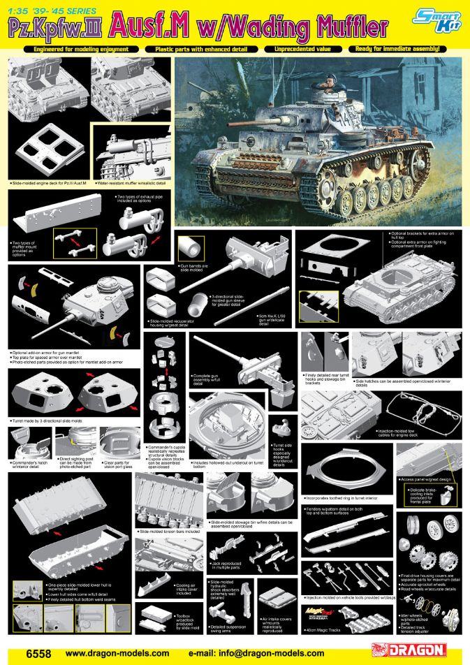 {"id":8318950113528,"title":"1\/35 Pz.Kpfw.III Ausf.M w\/Wading Muffler","handle":"1-35-pz-kpfw-iii-ausf-m-w-wading-muffler","description":"\u003ch3\u003eDragon 6558 - 1\/35 Pz.Kpfw.III Ausf.M w\/Wading Muffler\u003c\/h3\u003e\n\u003cdiv\u003e\n\u003cdiv id=\"main-nav-desc\"\u003e\n\u003cdiv\u003e\n\u003cp\u003eBy now most members of the popular Panzer III family have been created in 1\/35 scale as Smart Kits by Dragon. However, there was one glaring gap between the Ausf.E, F, H, J and N that needed to be filled. Now Dragon is very pleased to be able to announce the long-awaited release of the Panzer III Ausf.M! The Ausf.M was successor to the Ausf.L, and it shared the same 5cm KwK39 L\/60 main gun. Among its modifications was a deep-wading muffler with a series of associated hatch seals that allowed fording of water obstacles up to a depth of 1.3m. This performance represented a significant fording improvement over earlier Panzer IIIs. The hull-mounted smoke generators were also replaced with three 90mm NbK dischargers mounted either side of the turret. A total of 250 new Ausf.M tanks were produced from October 1942 to February 1943.\u003c\/p\u003e\n\u003cp\u003eInterestingly, a large number of medium Panzer III M tanks were converted into StuG.III or Panzer III Ausf.N vehicles. However, model-makers will certainly not wish to do so with their new kit, because inside the box lie all the necessary and desirable ingredients to create a spectacular Panzer III M with its deep-wading exhaust system. Offered as a Smart Kit, it is extremely well engineered and the parts separation is cleverly handled by the engineering team. In addition to the obviously exhaust system, one of the new components are the tow cables stowed on the engine deck. This 1\/35 plastic kit offers a perfect balance of accuracy and ease of assembly - the perfect project for modelers to wade into!\u003c\/p\u003e\n\u003c\/div\u003e\n\u003c\/div\u003e\n\u003c\/div\u003e\n\u003cdiv id=\"main-nav-details\"\u003e\n\u003cdiv class=\"h-titlebg1c\"\u003e\n\u003cstrong style=\"color: #ff2a00; font-size: 0.875rem;\"\u003eIn Stock Now\u003c\/strong\u003e\u003cbr\u003e\n\u003c\/div\u003e\n\u003c\/div\u003e","published_at":"2024-03-19T15:05:00+08:00","created_at":"2024-03-19T15:05:00+08:00","vendor":"Dragon","type":"Military","tags":["1\/35","Brand_Dragon","Dragon","Military","Scale Models","Scale_1\/35","Series_Military Vehicles","Status_In-Stock"],"price":39800,"price_min":39800,"price_max":39800,"available":false,"price_varies":false,"compare_at_price":null,"compare_at_price_min":0,"compare_at_price_max":0,"compare_at_price_varies":false,"variants":[{"id":44594349474040,"title":"Default Title","option1":"Default Title","option2":null,"option3":null,"sku":"DR06558","requires_shipping":true,"taxable":true,"featured_image":null,"available":false,"name":"1\/35 Pz.Kpfw.III Ausf.M w\/Wading Muffler","public_title":null,"options":["Default Title"],"price":39800,"weight":1500,"compare_at_price":null,"inventory_management":"shopify","barcode":null,"requires_selling_plan":false,"selling_plan_allocations":[]}],"images":["\/\/www.cyber-hobby.com\/cdn\/shop\/files\/6558.jpg?v=1710831943"],"featured_image":"\/\/www.cyber-hobby.com\/cdn\/shop\/files\/6558.jpg?v=1710831943","options":["Title"],"media":[{"alt":null,"id":32894941855992,"position":1,"preview_image":{"aspect_ratio":0.707,"height":952,"width":673,"src":"\/\/www.cyber-hobby.com\/cdn\/shop\/files\/6558.jpg?v=1710831943"},"aspect_ratio":0.707,"height":952,"media_type":"image","src":"\/\/www.cyber-hobby.com\/cdn\/shop\/files\/6558.jpg?v=1710831943","width":673}],"requires_selling_plan":false,"selling_plan_groups":[],"content":"\u003ch3\u003eDragon 6558 - 1\/35 Pz.Kpfw.III Ausf.M w\/Wading Muffler\u003c\/h3\u003e\n\u003cdiv\u003e\n\u003cdiv id=\"main-nav-desc\"\u003e\n\u003cdiv\u003e\n\u003cp\u003eBy now most members of the popular Panzer III family have been created in 1\/35 scale as Smart Kits by Dragon. However, there was one glaring gap between the Ausf.E, F, H, J and N that needed to be filled. Now Dragon is very pleased to be able to announce the long-awaited release of the Panzer III Ausf.M! The Ausf.M was successor to the Ausf.L, and it shared the same 5cm KwK39 L\/60 main gun. Among its modifications was a deep-wading muffler with a series of associated hatch seals that allowed fording of water obstacles up to a depth of 1.3m. This performance represented a significant fording improvement over earlier Panzer IIIs. The hull-mounted smoke generators were also replaced with three 90mm NbK dischargers mounted either side of the turret. A total of 250 new Ausf.M tanks were produced from October 1942 to February 1943.\u003c\/p\u003e\n\u003cp\u003eInterestingly, a large number of medium Panzer III M tanks were converted into StuG.III or Panzer III Ausf.N vehicles. However, model-makers will certainly not wish to do so with their new kit, because inside the box lie all the necessary and desirable ingredients to create a spectacular Panzer III M with its deep-wading exhaust system. Offered as a Smart Kit, it is extremely well engineered and the parts separation is cleverly handled by the engineering team. In addition to the obviously exhaust system, one of the new components are the tow cables stowed on the engine deck. This 1\/35 plastic kit offers a perfect balance of accuracy and ease of assembly - the perfect project for modelers to wade into!\u003c\/p\u003e\n\u003c\/div\u003e\n\u003c\/div\u003e\n\u003c\/div\u003e\n\u003cdiv id=\"main-nav-details\"\u003e\n\u003cdiv class=\"h-titlebg1c\"\u003e\n\u003cstrong style=\"color: #ff2a00; font-size: 0.875rem;\"\u003eIn Stock Now\u003c\/strong\u003e\u003cbr\u003e\n\u003c\/div\u003e\n\u003c\/div\u003e"}