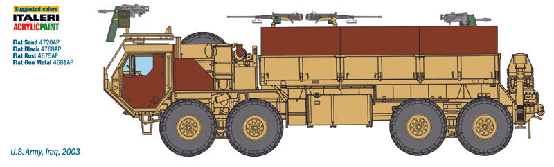 The acronym HEMTT (Heavy Expanded Mobility Tactical Truck) identifies a range eight-wheel drive off-road capable heavy truck, produced from the mid-80s for the United States Army. Thanks to its features, the HEMTT is able to guarantee a great off-road mobility and significant transportation performance. It has become the real “workhorse” of the Army capable of carrying ammunition and equipment in a very effective way. In a lot of conflicts, as in Iraq and Afghanistan, it has been often modified by the field workshops, on the specific requirements of the crews, in order to be more and more effective in the hard operating environments, Furthermore some HEMTT versions have been modified to be used in escort and convoys protection duties. Some additional protections and defensive weapons have been add on.