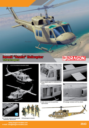 {"id":4461270499406,"title":"1\/35 Israeli \"Anafa\" Helicopter w\/Paratroopers","handle":"1-35-israeli-anafa-helicopter-w-paratroopers","description":"\u003ch3\u003eDragon 3543 - 1\/35 Israeli \"Anafa\" Helicopter w\/Paratroopers\u003c\/h3\u003e\n\u003cp\u003eIt is not often that Dragon releases a 1\/35 scale helicopter, which makes the present time even more exciting! Why? Because Dragon has released a UH-1N helicopter in this scale! The Bell UH-1N Twin Huey first flew in 1969 and it could carry 14 passengers in addition to the pilot. The UH-1N has been widely used by the US Air Force, US Navy and US Marine Corps, but another interesting user nation was Israel. The first Iroquois helicopters that Israel obtained were of the UH-1D type, but in the end it operated a mixed fleet of some 64 UH-1s of various types. Israel used its helicopters in various Middle East conflicts and against Palestinian militants for more than 30 years, before they were all retired in 2002 after being replaced by the UH-60 Black Hawk.\u003c\/p\u003e\n\u003cp\u003eThis plastic kit of the UH-1N is beautifully detailed, and it looks mightily impressive in this large scale. Cartograf supplies a set of well-registered markings to finish off this Israeli Huey. To make the set even more attractive, Dragon is throwing in a figure set of Israel Defense Forces (IDF) paratroopers. The Paratroopers Brigade is a renowned fighting force in Israel, and the unit has taken part in many missions. The four plastic figures stem from a much earlier release but their quality is still up to today’s standards. Together, the figures and helicopter can create an inspiring scene of air-ground cooperation in the Middle East.\u003c\/p\u003e\n\u003cul\u003e\n\u003cli\u003eUH-1N rendered w\/excellent detail\u003c\/li\u003e\n\u003cli\u003eClear-plastic parts for windshield and doors\u003c\/li\u003e\n\u003cli\u003eCabin doors can be assembled open\/closed\u003c\/li\u003e\n\u003cli\u003eFuselage rendered with fine details\u003c\/li\u003e\n\u003cli\u003e2.75-inch rocket launcher pods realistically reproduced\u003c\/li\u003e\n\u003cli\u003eParatroopers included\u003c\/li\u003e\n\u003c\/ul\u003e","published_at":"2019-12-17T11:13:14+08:00","created_at":"2019-12-17T11:13:14+08:00","vendor":"Dragon","type":"Military","tags":["1\/35","Aircraft","Brand_Dragon","Dragon","Helicopter","Military","Scale Models","Scale_1\/35","Series_Aircraft","Status_Out of Stock"],"price":36800,"price_min":36800,"price_max":36800,"available":false,"price_varies":false,"compare_at_price":null,"compare_at_price_min":0,"compare_at_price_max":0,"compare_at_price_varies":false,"variants":[{"id":31557289148494,"title":"Default Title","option1":"Default Title","option2":null,"option3":null,"sku":"DR03543","requires_shipping":true,"taxable":true,"featured_image":null,"available":false,"name":"1\/35 Israeli \"Anafa\" Helicopter w\/Paratroopers","public_title":null,"options":["Default Title"],"price":36800,"weight":2500,"compare_at_price":null,"inventory_management":"shopify","barcode":"","requires_selling_plan":false,"selling_plan_allocations":[]}],"images":["\/\/www.cyber-hobby.com\/cdn\/shop\/products\/DR03543.jpg?v=1576552474","\/\/www.cyber-hobby.com\/cdn\/shop\/products\/DR03543_1.jpg?v=1576552474"],"featured_image":"\/\/www.cyber-hobby.com\/cdn\/shop\/products\/DR03543.jpg?v=1576552474","options":["Title"],"media":[{"alt":null,"id":6043387691086,"position":1,"preview_image":{"aspect_ratio":1.449,"height":552,"width":800,"src":"\/\/www.cyber-hobby.com\/cdn\/shop\/products\/DR03543.jpg?v=1576552474"},"aspect_ratio":1.449,"height":552,"media_type":"image","src":"\/\/www.cyber-hobby.com\/cdn\/shop\/products\/DR03543.jpg?v=1576552474","width":800},{"alt":null,"id":6043387723854,"position":2,"preview_image":{"aspect_ratio":0.701,"height":1142,"width":800,"src":"\/\/www.cyber-hobby.com\/cdn\/shop\/products\/DR03543_1.jpg?v=1576552474"},"aspect_ratio":0.701,"height":1142,"media_type":"image","src":"\/\/www.cyber-hobby.com\/cdn\/shop\/products\/DR03543_1.jpg?v=1576552474","width":800}],"requires_selling_plan":false,"selling_plan_groups":[],"content":"\u003ch3\u003eDragon 3543 - 1\/35 Israeli \"Anafa\" Helicopter w\/Paratroopers\u003c\/h3\u003e\n\u003cp\u003eIt is not often that Dragon releases a 1\/35 scale helicopter, which makes the present time even more exciting! Why? Because Dragon has released a UH-1N helicopter in this scale! The Bell UH-1N Twin Huey first flew in 1969 and it could carry 14 passengers in addition to the pilot. The UH-1N has been widely used by the US Air Force, US Navy and US Marine Corps, but another interesting user nation was Israel. The first Iroquois helicopters that Israel obtained were of the UH-1D type, but in the end it operated a mixed fleet of some 64 UH-1s of various types. Israel used its helicopters in various Middle East conflicts and against Palestinian militants for more than 30 years, before they were all retired in 2002 after being replaced by the UH-60 Black Hawk.\u003c\/p\u003e\n\u003cp\u003eThis plastic kit of the UH-1N is beautifully detailed, and it looks mightily impressive in this large scale. Cartograf supplies a set of well-registered markings to finish off this Israeli Huey. To make the set even more attractive, Dragon is throwing in a figure set of Israel Defense Forces (IDF) paratroopers. The Paratroopers Brigade is a renowned fighting force in Israel, and the unit has taken part in many missions. The four plastic figures stem from a much earlier release but their quality is still up to today’s standards. Together, the figures and helicopter can create an inspiring scene of air-ground cooperation in the Middle East.\u003c\/p\u003e\n\u003cul\u003e\n\u003cli\u003eUH-1N rendered w\/excellent detail\u003c\/li\u003e\n\u003cli\u003eClear-plastic parts for windshield and doors\u003c\/li\u003e\n\u003cli\u003eCabin doors can be assembled open\/closed\u003c\/li\u003e\n\u003cli\u003eFuselage rendered with fine details\u003c\/li\u003e\n\u