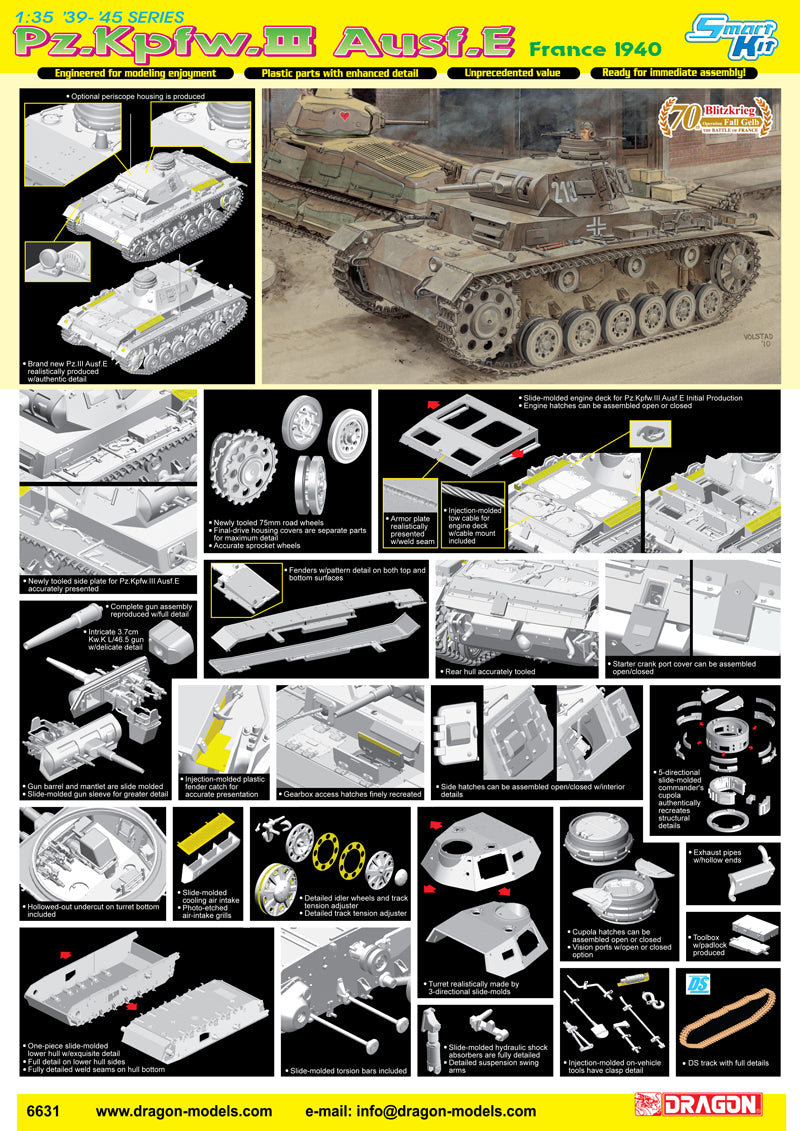 {"id":4829663789134,"title":"1\/35 Pz.Kpfw.III Ausf.E (France 1940)","handle":"1-35-pz-kpfw-iii-ausf-e-france-1940","description":"\u003ch3\u003eDragon 6631 - \u003cspan data-mce-fragment=\"1\"\u003e1\/35 Pz.Kpfw.III Ausf.E (France 1940)\u003c\/span\u003e\n\u003c\/h3\u003e\n\u003cp\u003eDuring the early Blitzkrieg campaigns in Poland and France, the Panzer III was a vital asset, although only several hundred were available at that time. They were also prominent in the invasion of Russia, with the Panzer III being numerically the most important tank for Germany. The first mass-produced version of the Panzer III was the Ausf.E, equipped with a 3.7cm KwK 36 main gun of 46.5 caliber, as well as three MG34 machine guns. Torsion bar suspension was standardized on the Ausf.E instead of the leaf springs used on earlier variants, and it was powered by a new 300hp Maybach HL120TR engine coupled to a 10-speed gearbox. Production of the Ausf.E commenced in December 1938, and a total of 96 tanks were manufactured up till October 1939. At 19.5 tons, the Ausf. E was significantly heavier than its predecessors.\u003c\/p\u003e\n\u003cp\u003eDragon has created a new 1\/35 scale Smart Kit of this particular German tank design. One desirable element in Dragon’s kit is the newly tooled road wheels, six per side. These wheels are different to those introduced on the Ausf.F kit (Item No. 6632). Other new parts to recreate this specific variant include the new side plates. This kit has been carefully researched and executed, and it is a must-have for modelers seeking a diorama of the Blitzkrieg era. This Smart Kit assembles easily, with the Pz.Kpfw.III Ausf.E being especially relevant to a combat scene in France in 1940, as depicted on the inspirational box-top illustration by Ron Volstad.\u003c\/p\u003e","published_at":"2020-09-11T14:30:52+08:00","created_at":"2020-09-11T14:30:52+08:00","vendor":"Dragon","type":"Military","tags":["1\/35","Brand_Dragon","Dragon","Military","Scale Models","scale_1\/35","Series_Military Vehicles","Status_Out of Stock"],"price":30800,"price_min":30800,"price_max":30800,"available":false,"price_varies":false,"compare_at_price":null,"compare_at_price_min":0,"compare_at_price_max":0,"compare_at_price_varies":false,"variants":[{"id":32607239536718,"title":"Default Title","option1":"Default Title","option2":null,"option3":null,"sku":"DR06631","requires_shipping":true,"taxable":true,"featured_image":null,"available":false,"name":"1\/35 Pz.Kpfw.III Ausf.E (France 1940)","public_title":null,"options":["Default Title"],"price":30800,"weight":2000,"compare_at_price":null,"inventory_management":"shopify","barcode":"","requires_selling_plan":false,"selling_plan_allocations":[]}],"images":["\/\/www.cyber-hobby.com\/cdn\/shop\/products\/DR06631_1.jpg?v=1599805892","\/\/www.cyber-hobby.com\/cdn\/shop\/products\/DR06631_2.jpg?v=1599805892"],"featured_image":"\/\/www.cyber-hobby.com\/cdn\/shop\/products\/DR06631_1.jpg?v=1599805892","options":["Title"],"media":[{"alt":null,"id":7853137756238,"position":1,"preview_image":{"aspect_ratio":1.581,"height":759,"width":1200,"src":"\/\/www.cyber-hobby.com\/cdn\/shop\/products\/DR06631_1.jpg?v=1599805892"},"aspect_ratio":1.581,"height":759,"media_type":"image","src":"\/\/www.cyber-hobby.com\/cdn\/shop\/products\/DR06631_1.jpg?v=1599805892","width":1200},{"alt":null,"id":7853137789006,"position":2,"preview_image":{"aspect_ratio":0.707,"height":1131,"width":800,"src":"\/\/www.cyber-hobby.com\/cdn\/shop\/products\/DR06631_2.jpg?v=1599805892"},"aspect_ratio":0.707,"height":1131,"media_type":"image","src":"\/\/www.cyber-hobby.com\/cdn\/shop\/products\/DR06631_2.jpg?v=1599805892","width":800}],"requires_selling_plan":false,"selling_plan_groups":[],"content":"\u003ch3\u003eDragon 6631 - \u003cspan data-mce-fragment=\"1\"\u003e1\/35 Pz.Kpfw.III Ausf.E (France 1940)\u003c\/span\u003e\n\u003c\/h3\u003e\n\u003cp\u003eDuring the early Blitzkrieg campaigns in Poland and France, the Panzer III was a vital asset, although only several hundred were available at that time. They were also prominent in the invasion of Russia, with the Panzer III being numerically the most important tank for Germany. The first mass-produced version of the Panzer III was the Ausf.E, equipped with a 3.7cm KwK 36 main gun of 46.5 caliber, as well as three MG34 machine guns. Torsion bar suspension was standardized on the Ausf.E instead of the leaf springs used on earlier variants, and it was powered by a new 300hp Maybach HL120TR engine coupled to a 10-speed gearbox. Production of the Ausf.E commenced in December 1938, and a total of 96 tanks were manufactured up till October 1939. At 19.5 tons, the Ausf. E was significantly heavier than its predecessors.\u003c\/p\u003e\n\u003cp\u003eDragon has created a new 1\/35 scale Smart Kit of this particular German tank design. One desirable element in Dragon’s kit is the newly tooled road wheels, six per side. These wheels are different to those introduced on the Ausf.F kit (Item No. 6632). Other new parts to recreate this specific variant include the new side plates. This kit has been carefully researched and executed, and it is a must-have for modelers seeking a diorama of the Blitzkrieg era. This Smart Kit assembles easily, with the Pz.Kpfw.III Ausf.E being especially relevant to a combat scene in France in 1940, as depicted on the inspirational box-top illustration by Ron Volstad.\u003c\/p\u003e"}