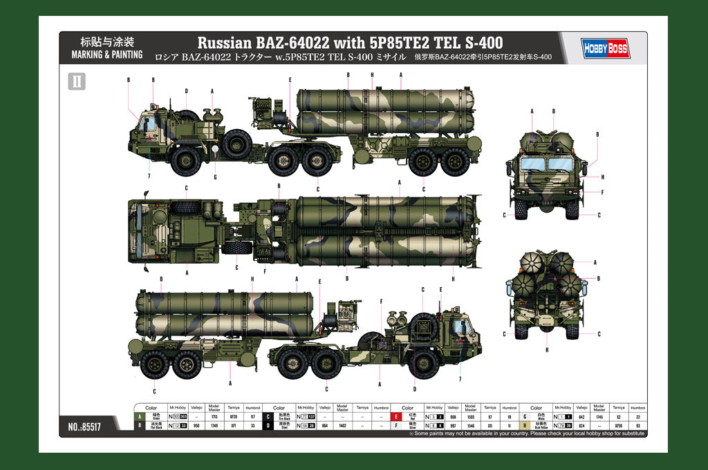 {"id":4067063365710,"title":"1\/35 Russian BAZ-64022 with 5P85TE2 TEL S-400","handle":"1-35-russian-baz-64022-with-5p85te2-tel-s-400","description":"\u003ch3\u003eHobby Boss 85517 - 1\/35 Russian BAZ-64022 with 5P85TE2 TEL S-400\u003c\/h3\u003e\n\u003cp style=\"font-weight: 400;\"\u003eThe S-400 Triumph (NATO reporting name: SA-21 Growler), previously known as S-300PMU-3, is an anti-aircraft weapon system developed by Russia's Almaz Central Design Bureau in the 1990s as an upgrade of the S-300 family. It has been in service with the Russian Armed Forces since 2007.\u003c\/p\u003e\n\u003cp style=\"font-weight: 400;\"\u003eThe development of the S-400 system began in the late 1990s. The system was formally announced by the Russian Air Force in January 1999. On 12 February 1999, the first tests were performed at Kapustin Yar inAstrakhanwhich were reported successful. As a result of this, the S-400 was scheduled for deployment in the Russian army in 2001.\u003c\/p\u003e\n\u003cp style=\"font-weight: 400;\"\u003eThe completion of the project was announced in February 2004. In April, a ballistic missile was intercepted in a test of the upgraded 48N6DM interceptor missile. Officially accepted for service in 2007.\u003c\/p\u003e","published_at":"2019-08-28T13:54:05+08:00","created_at":"2019-08-28T13:58:12+08:00","vendor":"Hobby Boss","type":"Military","tags":["1\/35","Brand_Hobby Boss","Hobby Boss","Military","Scale Models","Scale_1\/35","Series_Military Vehicles","Status_Out of Stock"],"price":72800,"price_min":72800,"price_max":72800,"available":false,"price_varies":false,"compare_at_price":null,"compare_at_price_min":0,"compare_at_price_max":0,"compare_at_price_varies":false,"variants":[{"id":29836690915406,"title":"Default Title","option1":"Default Title","option2":null,"option3":null,"sku":"HB85517","requires_shipping":true,"taxable":true,"featured_image":null,"available":false,"name":"1\/35 Russian BAZ-64022 with 5P85TE2 TEL S-400","public_title":null,"options":["Default Title"],"price":72800,"weight":4000,"compare_at_price":null,"inventory_management":"shopify","barcode":"","requires_selling_plan":false,"selling_plan_allocations":[]}],"images":["\/\/www.cyber-hobby.com\/cdn\/shop\/products\/HB85517.jpg?v=1566971895","\/\/www.cyber-hobby.com\/cdn\/shop\/products\/HB85517_01.jpg?v=1566971898","\/\/www.cyber-hobby.com\/cdn\/shop\/products\/HB85517_02.jpg?v=1566971900","\/\/www.cyber-hobby.com\/cdn\/shop\/products\/HB85517_03.jpg?v=1566971902","\/\/www.cyber-hobby.com\/cdn\/shop\/products\/HB85517_04.jpg?v=1566971903","\/\/www.cyber-hobby.com\/cdn\/shop\/products\/HB85517_05.jpg?v=1566971906","\/\/www.cyber-hobby.com\/cdn\/shop\/products\/HB85517_06.jpg?v=1566971908","\/\/www.cyber-hobby.com\/cdn\/shop\/products\/HB85517_07.jpg?v=1566971909","\/\/www.cyber-hobby.com\/cdn\/shop\/products\/HB85517_08.jpg?v=1566971911","\/\/www.cyber-hobby.com\/cdn\/shop\/products\/HB85517_09.jpg?v=1566971913","\/\/www.cyber-hobby.com\/cdn\/shop\/products\/HB85517_10.jpg?v=1566971917","\/\/www.cyber-hobby.com\/cdn\/shop\/products\/HB85517_11.jpg?v=1566971919","\/\/www.cyber-hobby.com\/cdn\/shop\/products\/HB85517_12.jpg?v=1566971921","\/\/www.cyber-hobby.com\/cdn\/shop\/products\/HB85517_13.jpg?v=1566971923","\/\/www.cyber-hobby.com\/cdn\/shop\/products\/HB85517_14.jpg?v=1566971925","\/\/www.cyber-hobby.com\/cdn\/shop\/products\/HB85517_15.jpg?v=1566971927","\/\/www.cyber-hobby.com\/cdn\/shop\/products\/HB85517_16.jpg?v=1566971930"],"featured_image":"\/\/www.cyber-hobby.com\/cdn\/shop\/products\/HB85517.jpg?v=1566971895","options":["Title"],"media":[{"alt":null,"id":1532657369166,"position":1,"preview_image":{"aspect_ratio":1.504,"height":681,"width":1024,"src":"\/\/www.cyber-hobby.com\/cdn\/shop\/products\/HB85517.jpg?v=1566971895"},"aspect_ratio":1.504,"height":681,"media_type":"image","src":"\/\/www.cyber-hobby.com\/cdn\/shop\/products\/HB85517.jpg?v=1566971895","width":1024},{"alt":null,"id":1532657598542,"position":2,"preview_image":{"aspect_ratio":1.504,"height":681,"width":1024,"src":"\/\/www.cyber-hobby.com\/cdn\/shop\/products\/HB85517_01.jpg?v=1566971898"},"aspect_ratio":1.504,"height":681,"media_type":"image","src":"\/\/www.cyber-hobby.com\/cdn\/shop\/products\/HB85517_01.jpg?v=1566971898","width":1024},{"alt":null,"id":1532657762382,"position":3,"preview_image":{"aspect_ratio":1.504,"height":681,"width":1024,"src":"\/\/www.cyber-hobby.com\/cdn\/shop\/products\/HB85517_02.jpg?v=1566971900"},"aspect_ratio":1.504,"height":681,"media_type":"image","src":"\/\/www.cyber-hobby.com\/cdn\/shop\/products\/HB85517_02.jpg?v=1566971900","width":1024},{"alt":null,"id":1532658122830,"position":4,"preview_image":{"aspect_ratio":1.504,"height":681,"width":1024,"src":"\/\/www.cyber-hobby.com\/cdn\/shop\/products\/HB85517_03.jpg?v=1566971902"},"aspect_ratio":1.504,"height":681,"media_type":"image","src":"\/\/www.cyber-hobby.com\/cdn\/shop\/products\/HB85517_03.jpg?v=1566971902","width":1024},{"alt":null,"id":1532658352206,"position":5,"preview_image":{"aspect_ratio":1.504,"height":681,"width":1024,"src":"\/\/www.cyber-hobby.com\/cdn\/shop\/products\/HB85517_04.jpg?v=1566971903"},"aspect_ratio":1.504,"height":681,"media_type":"image","src":"\/\/www.cyber-hobby.com\/cdn\/shop\/products\/HB85517_04.jpg?v=1566971903","width":1024},{"alt":null,"id":1532658516046,"position":6,"preview_image":{"aspect_ratio":1.506,"height":680,"width":1024,"src":"\/\/www.cyber-hobby.com\/cdn\/shop\/products\/HB85517_05.jpg?v=1566971906"},"aspect_ratio":1.506,"height":680,"media_type":"image","src":"\/\/www.cyber-hobby.com\/cdn\/shop\/products\/HB85517_05.jpg?v=1566971906","width":1024},{"alt":null,"id":1532658647118,"position":7,"preview_image":{"aspect_ratio":1.506,"height":680,"width":1024,"src":"\/\/www.cyber-hobby.com\/cdn\/shop\/products\/HB85517_06.jpg?v=1566971908"},"aspect_ratio":1.506,"height":680,"media_type":"image","src":"\/\/www.cyber-hobby.com\/cdn\/shop\/products\/HB85517_06.jpg?v=1566971908","width":1024},{"alt":null,"id":1532
