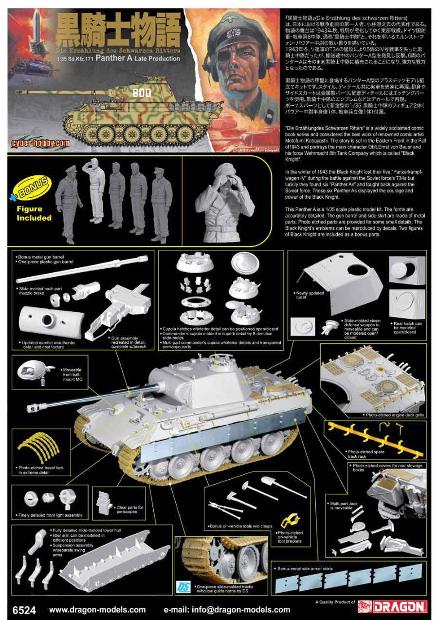 {"id":4413277732942,"title":"1\/35 Sd.Kfz.171 Panther A Late Production \"Black Knight\"","handle":"1-35-sd-kfz-171-panther-a-late-production-black-knight","description":"\u003ch3\u003eDragon 6524 - \u003cspan\u003e1\/35 Sd.Kfz.171 Panther A Late Production \"Black Knight\"\u003c\/span\u003e\n\u003c\/h3\u003e\n\u003cp\u003e\"Die Erza\"hlungdes Schwarzen Ritters\" is a widely acclaimed comic book series and considered the best work of renowned comic artist Motofumi Kobayashi. The story is set in the Eastern Front in the Fall of 1943 and portrays the main character Oblt.Ernst von Bauer and his force Wehrmacht 8th Tank Company which is called \"Black Knight\".\u003c\/p\u003e\n\u003cp\u003eIn the winter of 1943, the Black Knight lost their five \"Panzerkampfwagen IV\" during the battle against the Soviet force's T34s but luckily they found six \"Panther As\" and fought back against the Soviet force. These six Panther As displayed the courage and power of the Black Knight.\u003c\/p\u003e\n\u003cp\u003eThis Panther A is a 1\/35 scale plastic model kit. The forms are accurately detailed. The gun barrel and side skirt are made of metal parts. Photo etched parts are provided for some small details. The Black Knight's emblems can be reproduced by decals. Two figures of Black Knight are included as a bonus parts.\u003c\/p\u003e","published_at":"2019-12-01T12:39:39+08:00","created_at":"2019-12-01T12:48:06+08:00","vendor":"Cyber Hobby","type":"Military","tags":["1\/35","Brand_Cyber Hobby","Brand_Dragon","Cyber Hobby","Cyber Hobby Exclusive","Dragon","Military","Scale Models","Scale_1\/35","Series_Military Vehicles","Status_Out of Stock","vintage"],"price":45000,"price_min":45000,"price_max":45000,"available":false,"price_varies":false,"compare_at_price":null,"compare_at_price_min":0,"compare_at_price_max":0,"compare_at_price_varies":false,"variants":[{"id":31417474121806,"title":"Default Title","option1":"Default Title","option2":null,"option3":null,"sku":"DR06524","requires_shipping":true,"taxable":true,"featured_image":null,"available":false,"name":"1\/35 Sd.Kfz.171 Panther A Late Production \"Black Knight\"","public_title":null,"options":["Default Title"],"price":45000,"weight":2000,"compare_at_price":null,"inventory_management":"shopify","barcode":"","requires_selling_plan":false,"selling_plan_allocations":[]}],"images":["\/\/www.cyber-hobby.com\/cdn\/shop\/products\/DR06524.jpg?v=1575175687","\/\/www.cyber-hobby.com\/cdn\/shop\/products\/DR06524_1.jpg?v=1575175687"],"featured_image":"\/\/www.cyber-hobby.com\/cdn\/shop\/products\/DR06524.jpg?v=1575175687","options":["Title"],"media":[{"alt":null,"id":5876214333518,"position":1,"preview_image":{"aspect_ratio":1.888,"height":329,"width":621,"src":"\/\/www.cyber-hobby.com\/cdn\/shop\/products\/DR06524.jpg?v=1575175687"},"aspect_ratio":1.888,"height":329,"media_type":"image","src":"\/\/www.cyber-hobby.com\/cdn\/shop\/products\/DR06524.jpg?v=1575175687","width":621},{"alt":null,"id":5876214366286,"position":2,"preview_image":{"aspect_ratio":0.707,"height":1273,"width":900,"src":"\/\/www.cyber-hobby.com\/cdn\/shop\/products\/DR06524_1.jpg?v=1575175687"},"aspect_ratio":0.707,"height":1273,"media_type":"image","src":"\/\/www.cyber-hobby.com\/cdn\/shop\/products\/DR06524_1.jpg?v=1575175687","width":900}],"requires_selling_plan":false,"selling_plan_groups":[],"content":"\u003ch3\u003eDragon 6524 - \u003cspan\u003e1\/35 Sd.Kfz.171 Panther A Late Production \"Black Knight\"\u003c\/span\u003e\n\u003c\/h3\u003e\n\u003cp\u003e\"Die Erza\"hlungdes Schwarzen Ritters\" is a widely acclaimed comic book series and considered the best work of renowned comic artist Motofumi Kobayashi. The story is set in the Eastern Front in the Fall of 1943 and portrays the main character Oblt.Ernst von Bauer and his force Wehrmacht 8th Tank Company which is called \"Black Knight\".\u003c\/p\u003e\n\u003cp\u003eIn the winter of 1943, the Black Knight lost their five \"Panzerkampfwagen IV\" during the battle against the Soviet force's T34s but luckily they found six \"Panther As\" and fought back against the Soviet force. These six Panther As displayed the courage and power of the Black Knight.\u003c\/p\u003e\n\u003cp\u003eThis Panther A is a 1\/35 scale plastic model kit. The forms are accurately detailed. The gun barrel and side skirt are made of metal parts. Photo etched parts are provided for some small details. The Black Knight's emblems can be reproduced by decals. Two figures of Black Knight are included as a bonus parts.\u003c\/p\u003e"}