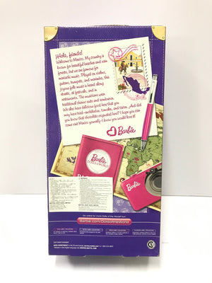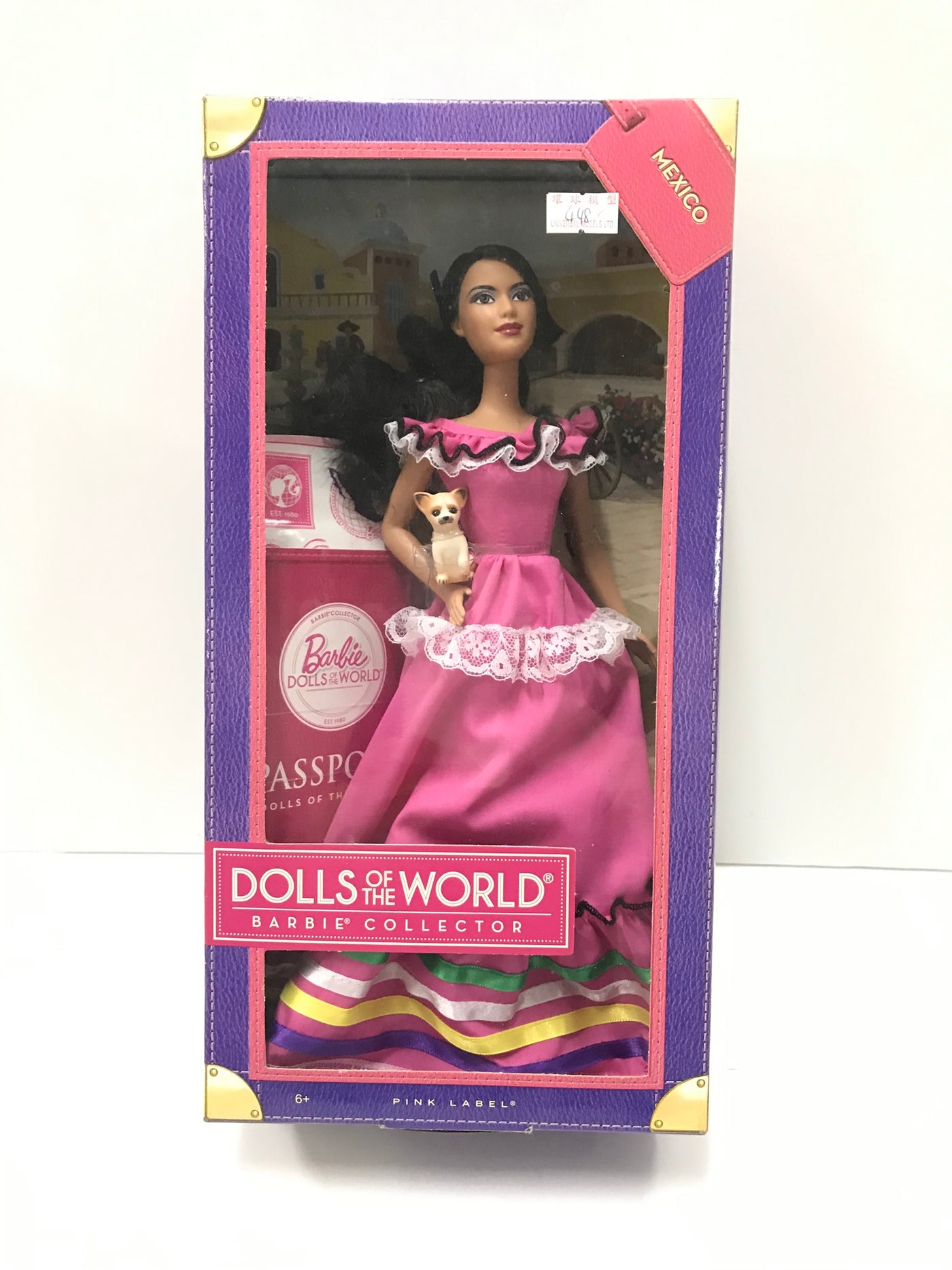 ᄀHola! Welcome to Mexico! Inspired by traditional mariachis and marimbas, Mexico Barbie® doll is ready for any fiesta! Doll wears a bright pink ruffled dress with colorful lace and ribbon accents. Includes "passport, " country stickers, Chihuahua friend and brush.